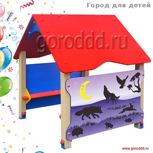 Детский домик «Лунная дорожка» У2 (ИМ146) с двухсторонней УФ-печатью – современное оборудование для детских площадок! Главная особенность этого уличного домика для детей — развивающая игровая панель. С одной стороны изображены животные в таинственном свете Луны (темные силуэты), а с другой — те же герои в ярких красках солнечного дня. Это не просто домик, а пространство для развития воображения и обучения через игру. Домик относится к конструкции открытого типа (без пола) и включает две уютные детские лавочки, где малыши могут отдыхать и общаться.